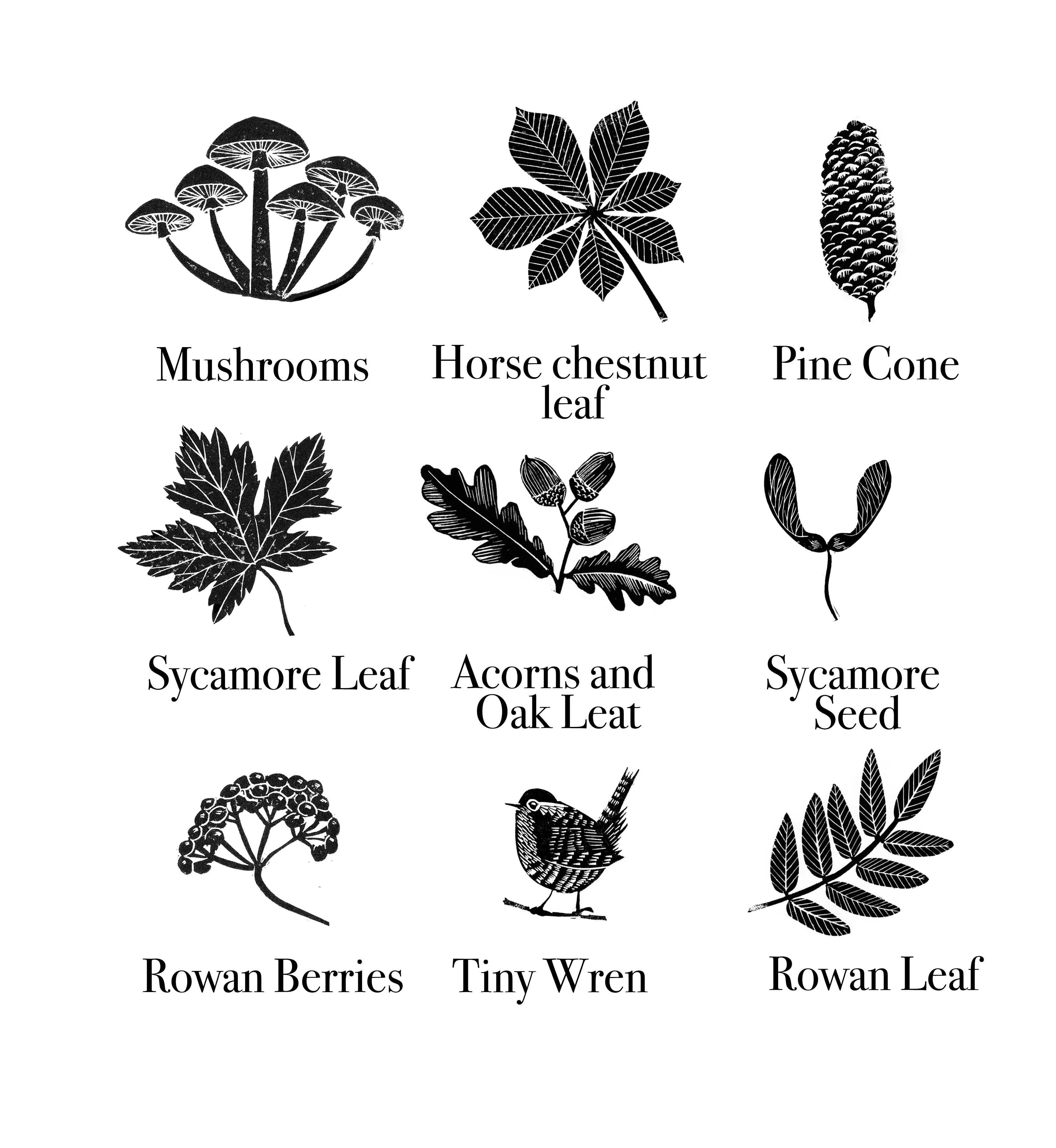 An autumnal selection of leaves berries, mushrooms and a little wren.. All these stamps are sold separately or can be purchased as a set.