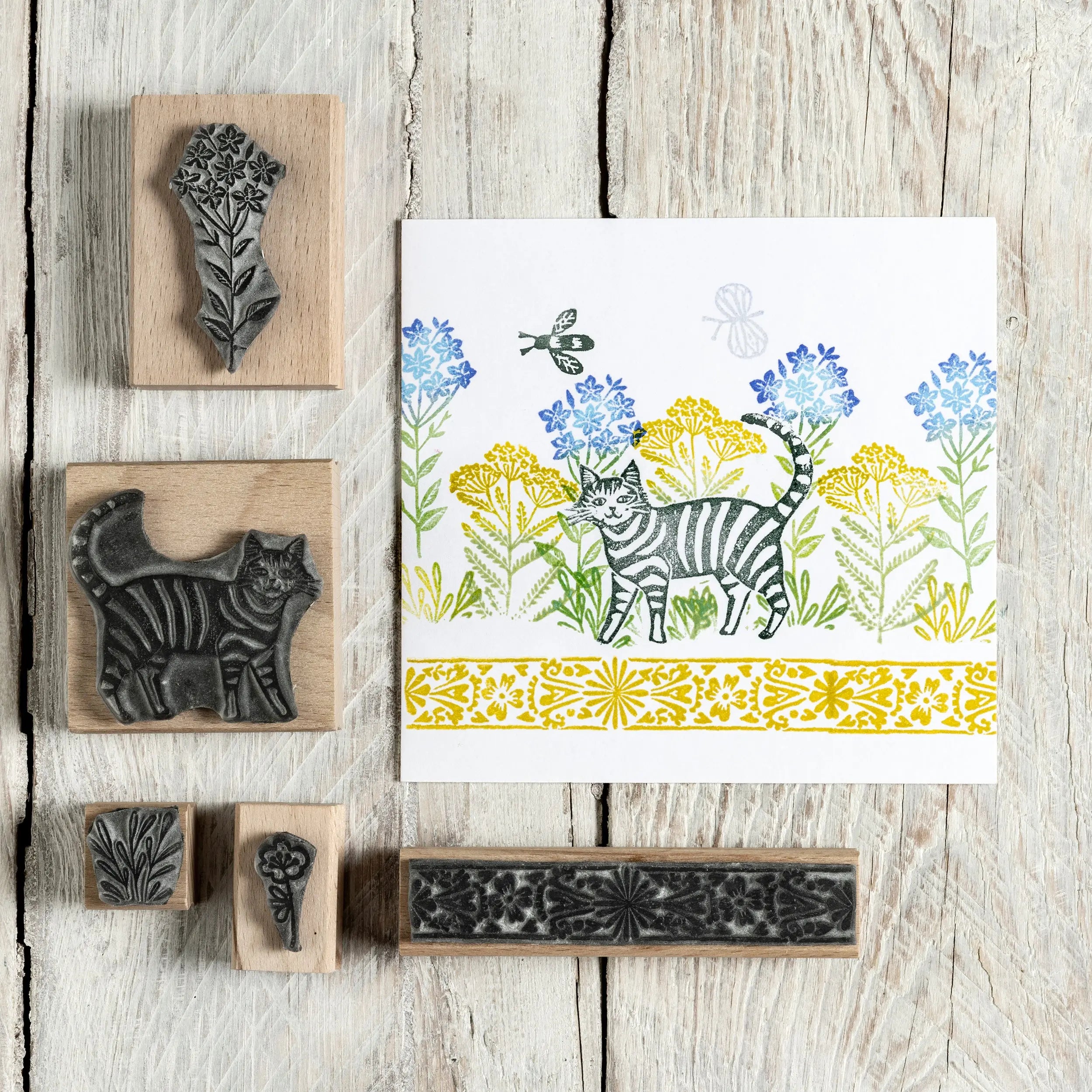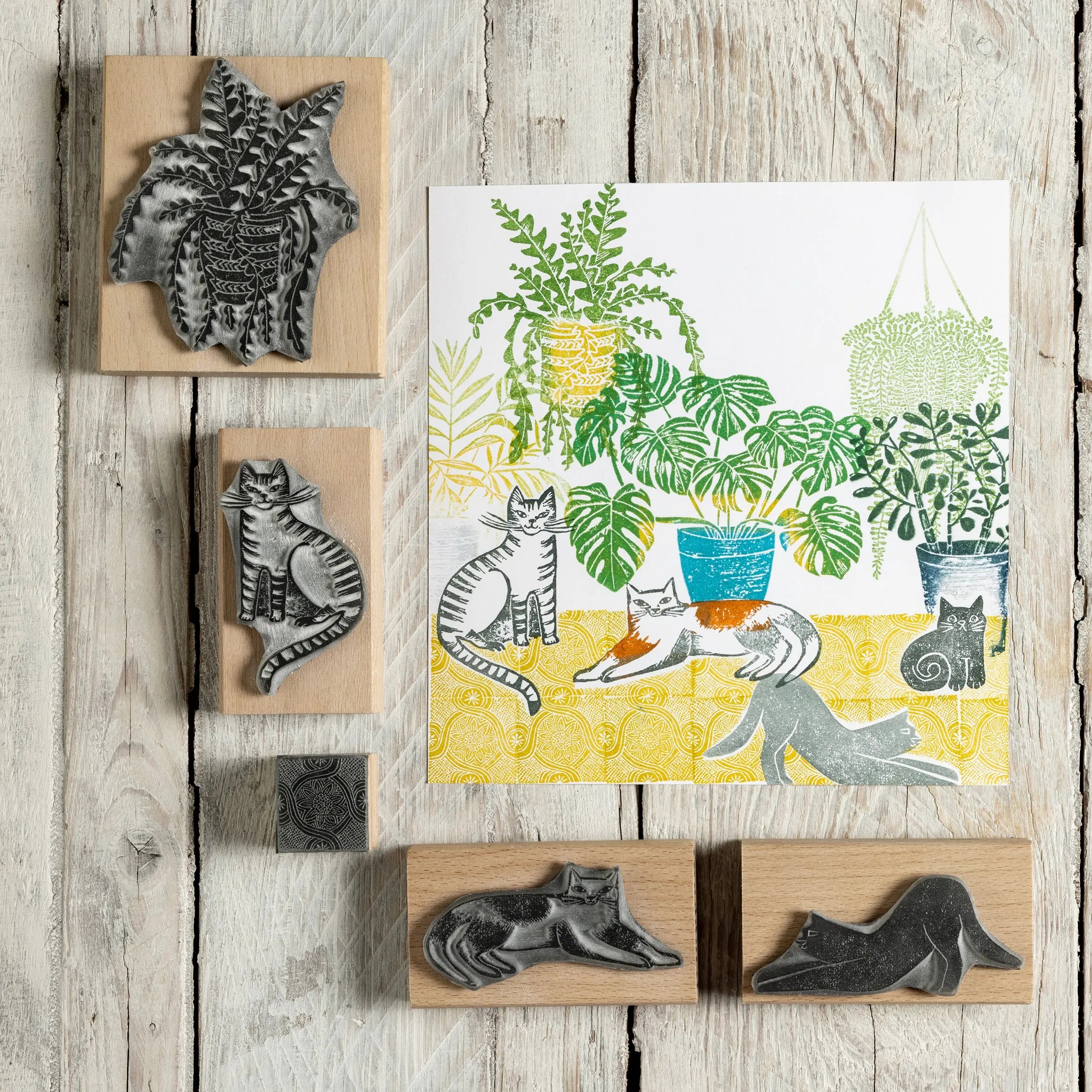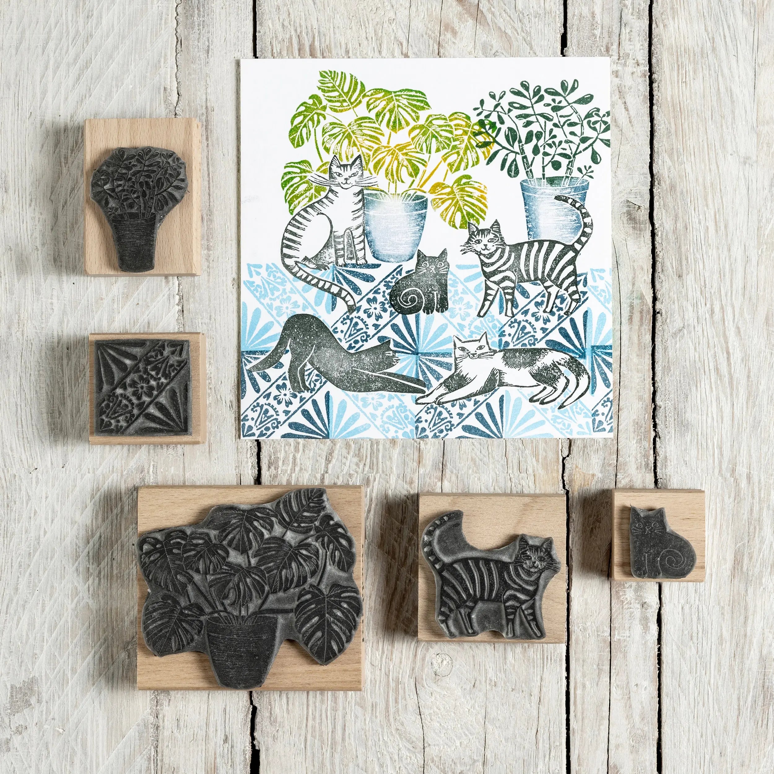 A fun collection of Cat Rubber stamps with some Houseplants and tiles so that you can make up a decorative little scene for a card design or some wrapping paper. All these designs were made using a lino cutting technique. All the stamps here are available to buy separately or in the following sets listed below;