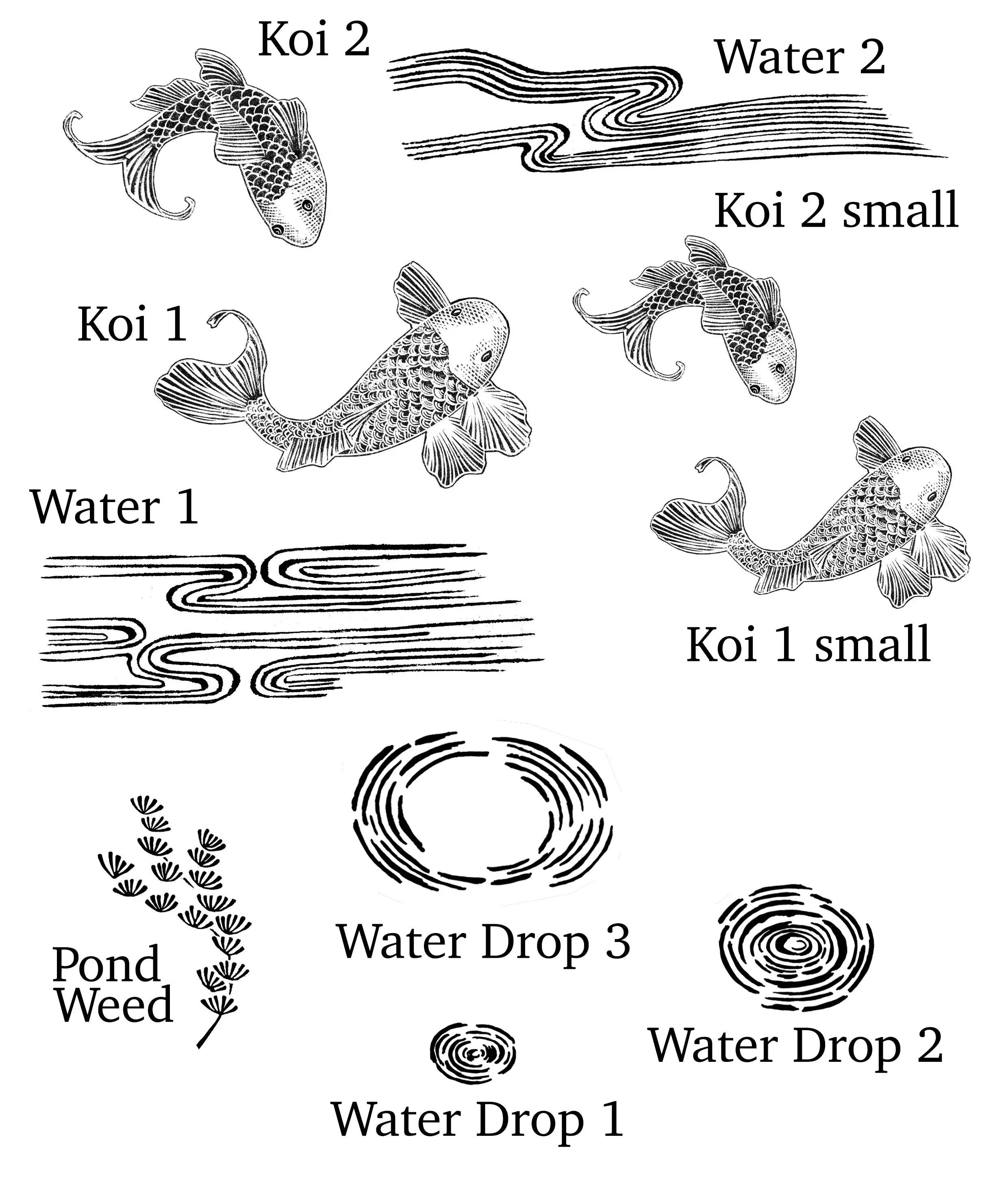 These Koi Carp Rubber stamps were inspired by antique Japanese Prints of Koi Carp, and designed using a lino cutting tecnique. The watery stamps and water weed or pond weed help to complete the scene.