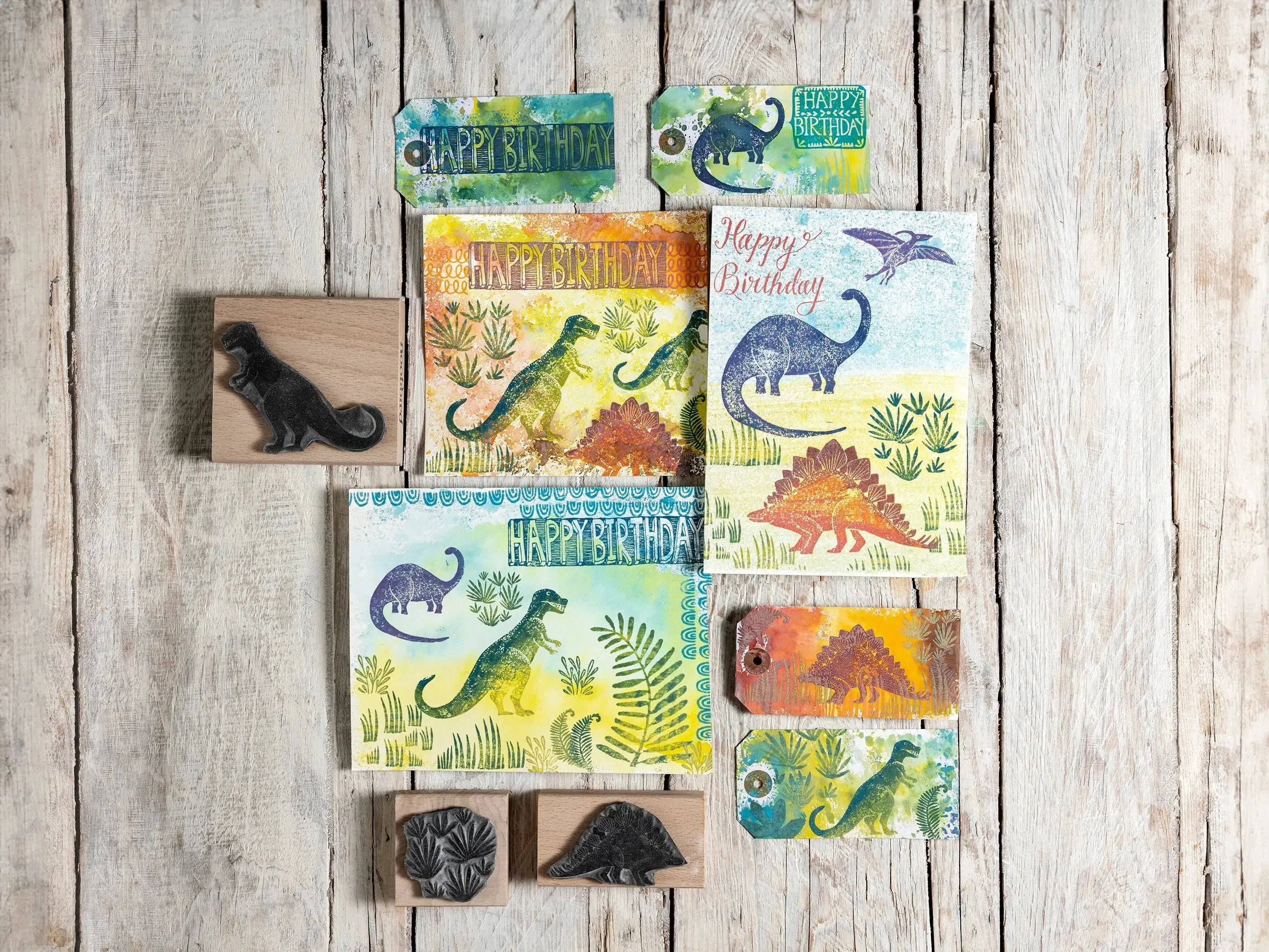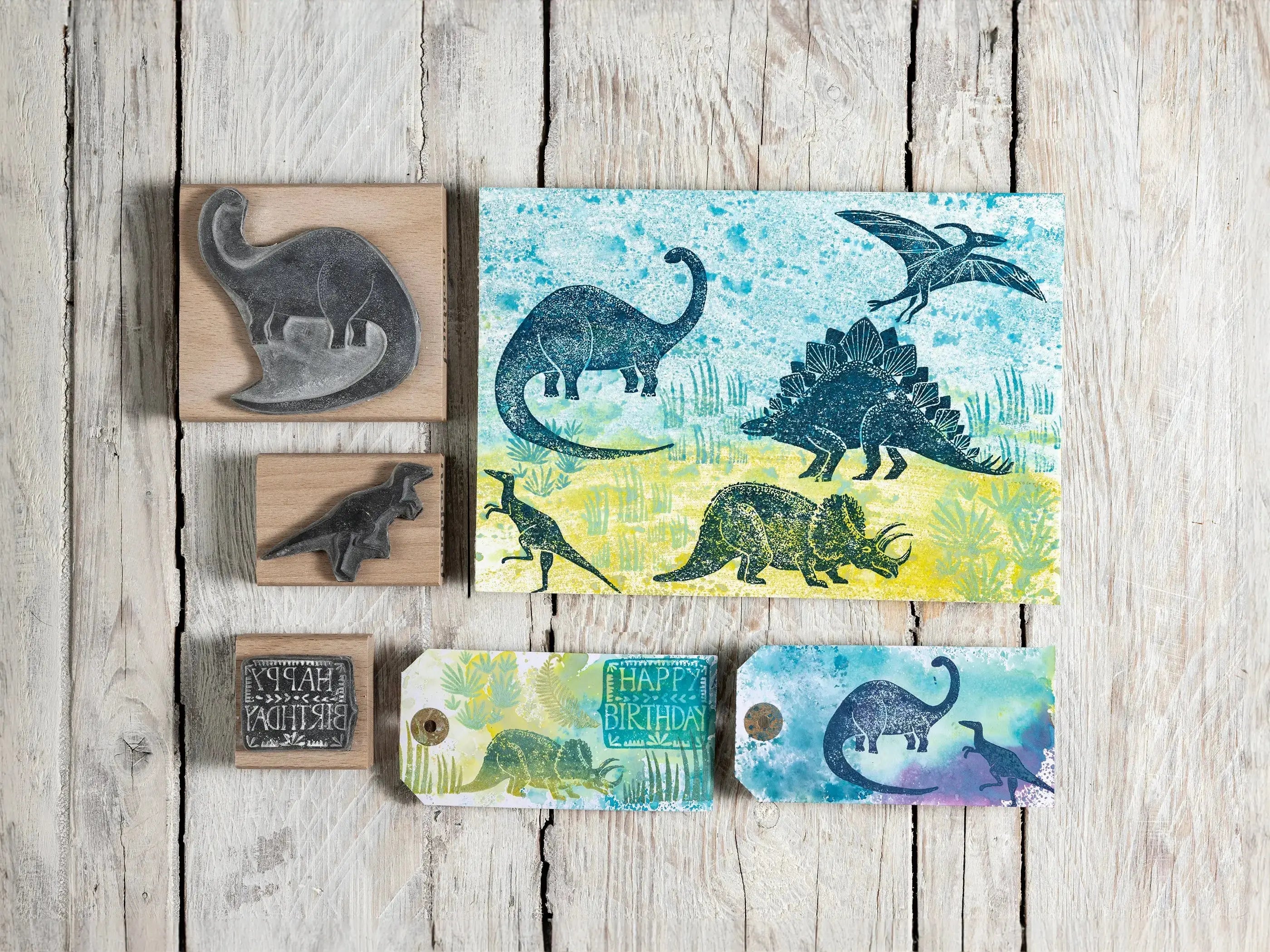 An adventure into the prehistoric world of the Dinosaurs, with this fun collection of Dinosaur Rubber Stamps. Create a jurassic landscape with the addition of a volcano and some triassic plants. I have used pencil crayons to sketch in some background colour in the main image and I have been experimenting with some Tim Holtz Distress Oxide ink pads for the backgrounds of the Birthday cards and gift tags. I hope to be offering these in my Etsy shop very soon.