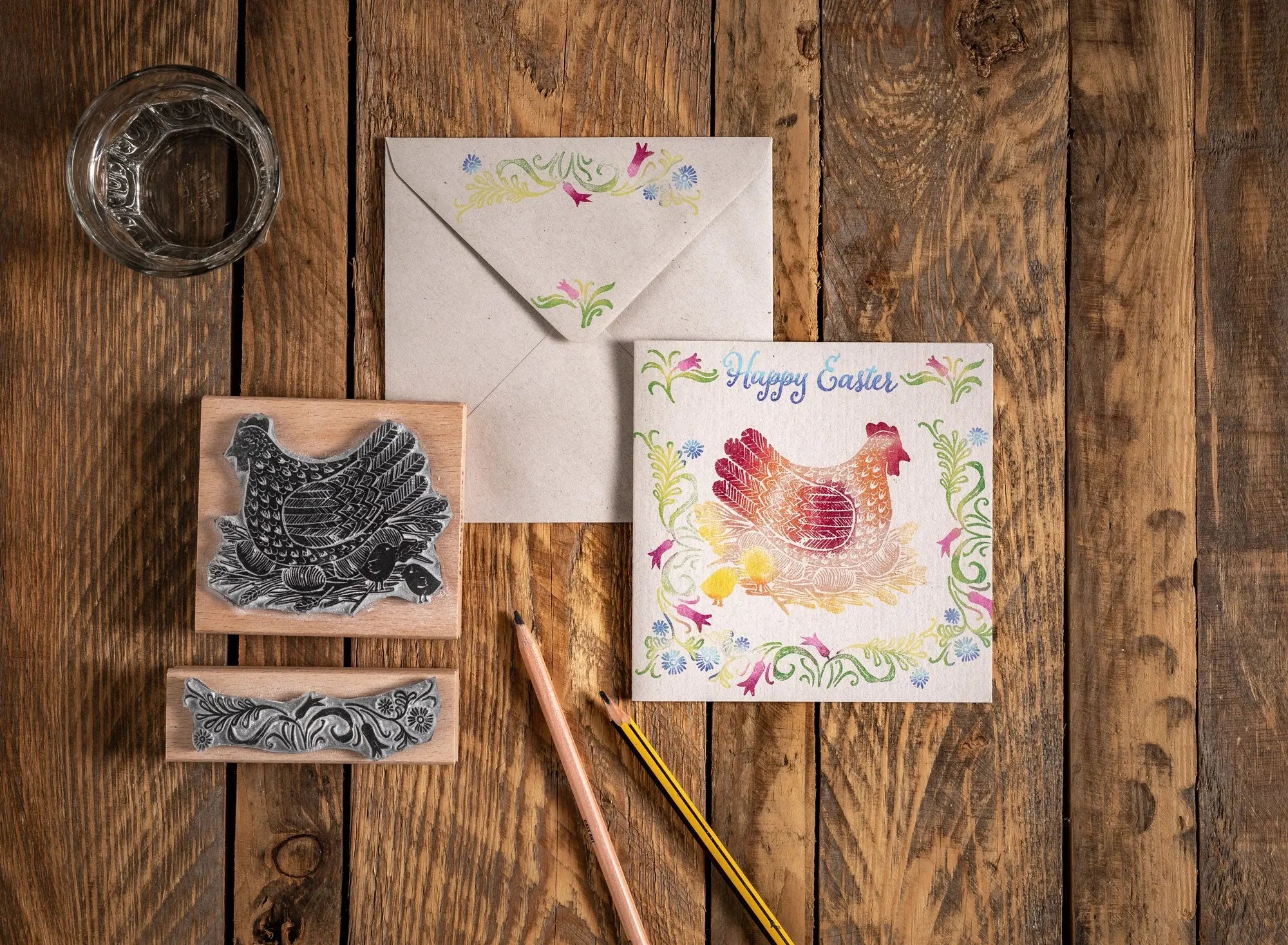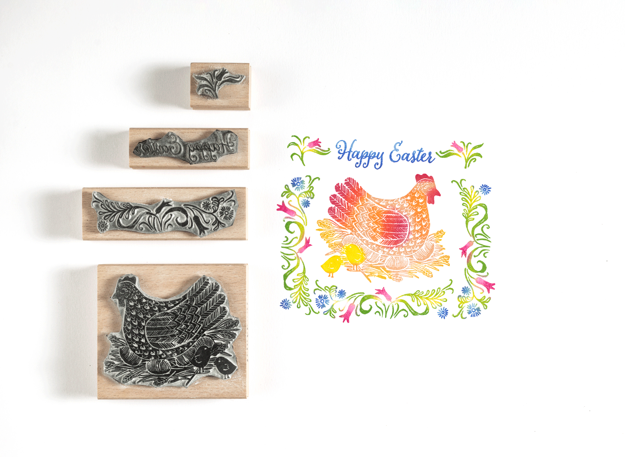 Here is an extra big Easter Egg Stamp, it is decorated with folky flowers the design was done from a lino cut. I have used a mix or ink pads to get the graduating colour.