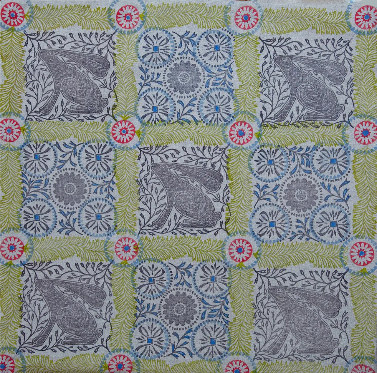 A sitting hare surrounded by decorative leafy foliage. This is a beautiful stamp just as it is, but I have been using it to stamp cushions and cards with a leafy border shown here and a little flower stamp.