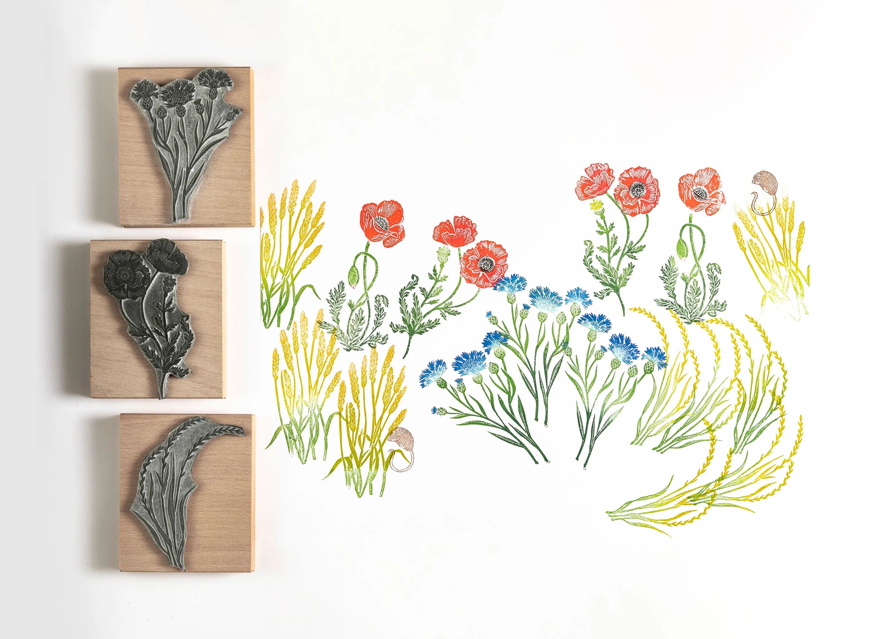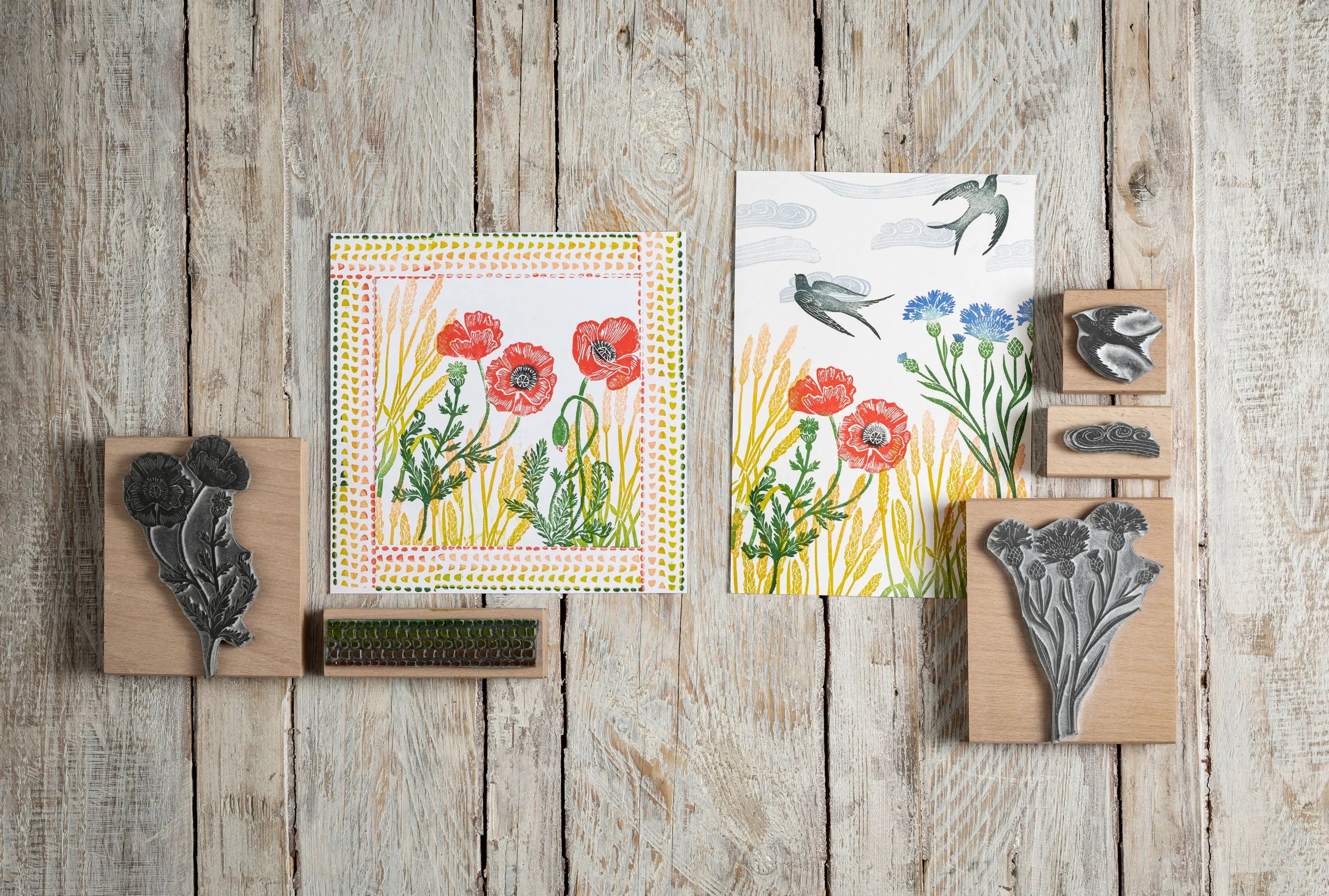 A Hot and hazy collection of Summer Meadow Rubber Stamps to make you think of a country walk on a summers day. These designs were crafted using a lino cut technique then made into rubber stamps.