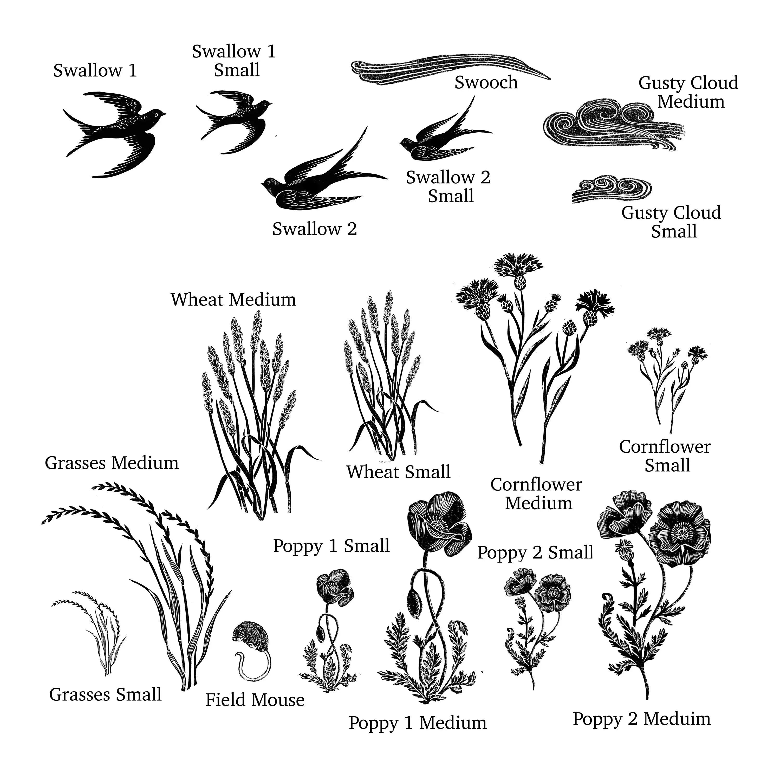 They are all being sold separately but are also available as a set in the Medium or small sizes. The sets include all the plant stamps and field mouse. The Swallows and Clouds are also available as a Set of the 2 larger swallows and the cloud and swooch stamps.