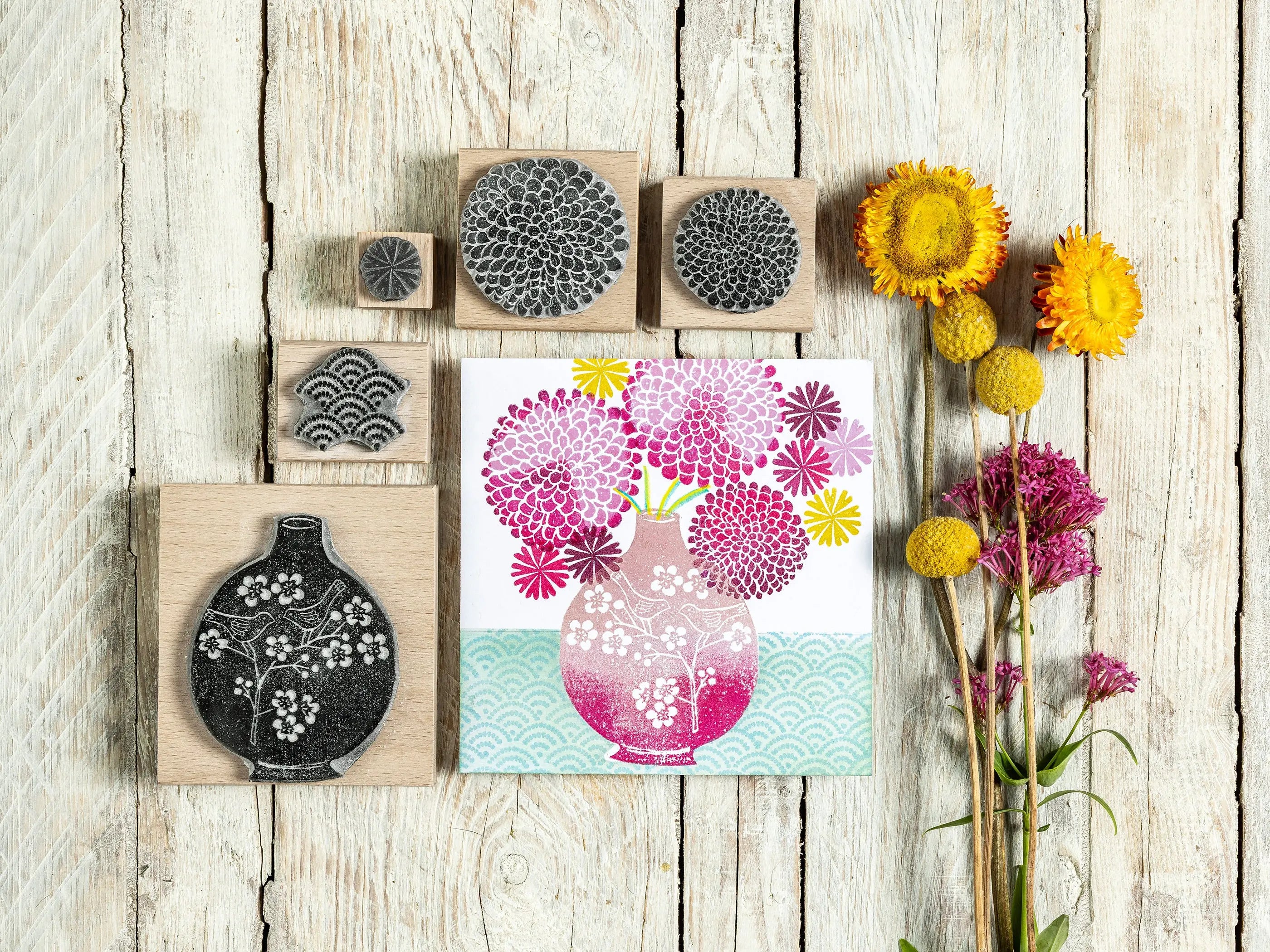 Drawing inspiration from the rich visual language of Japanese art and textiles, this collection celebrates the effortless way Japanese design mixes bold florals, intricate geometry, and natural imagery with stunning balance and grace. Whether you're making handmade cards, printing on fabric, or crafting your own wrapping paper, these stamps invite you to slow down, play, and create with intention.